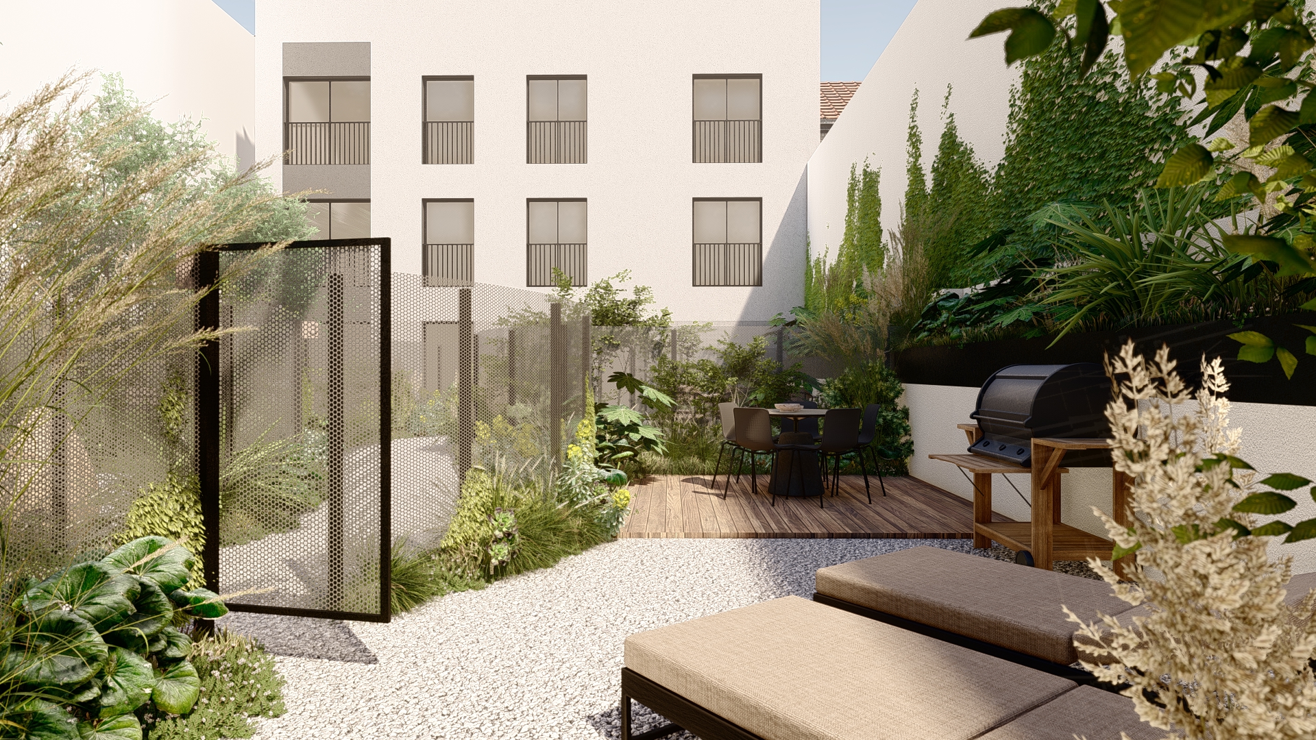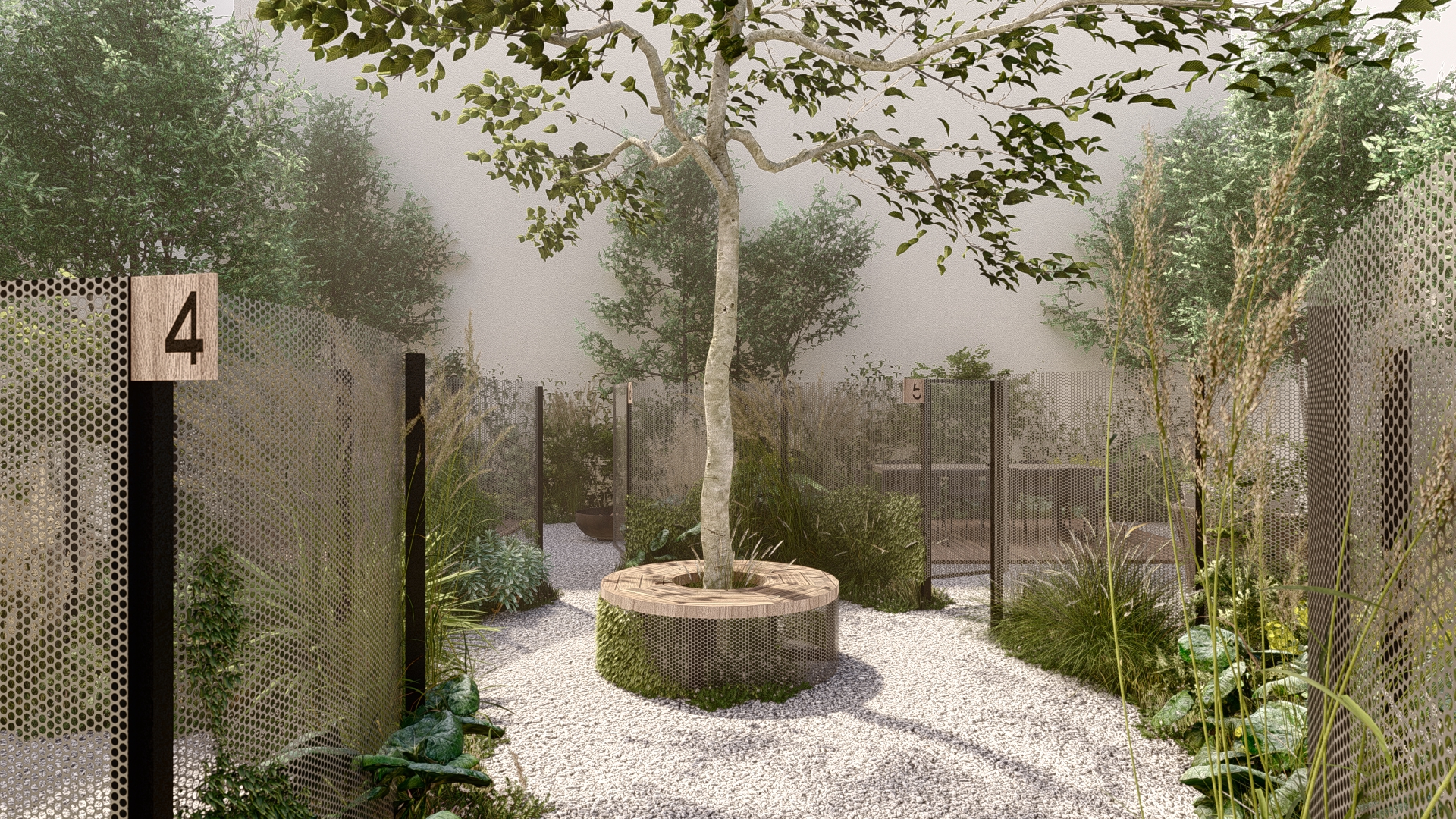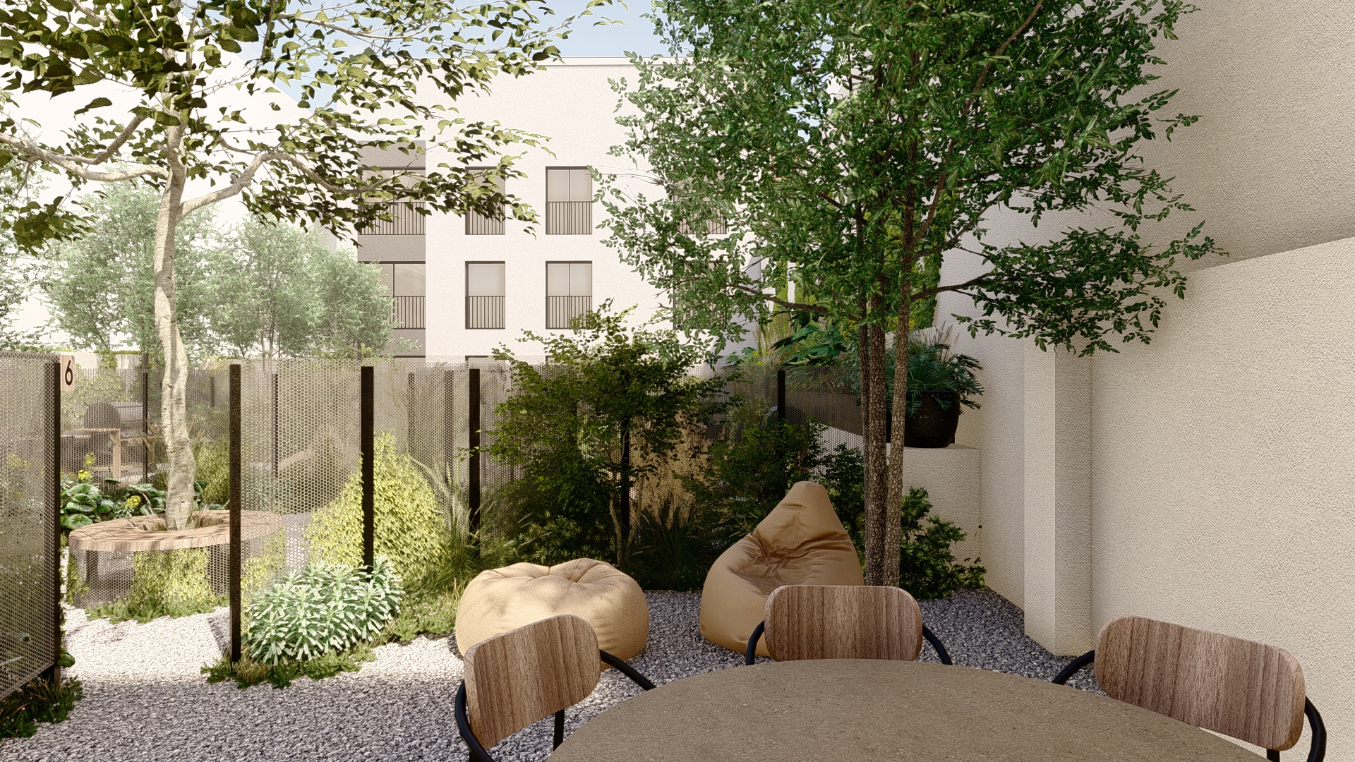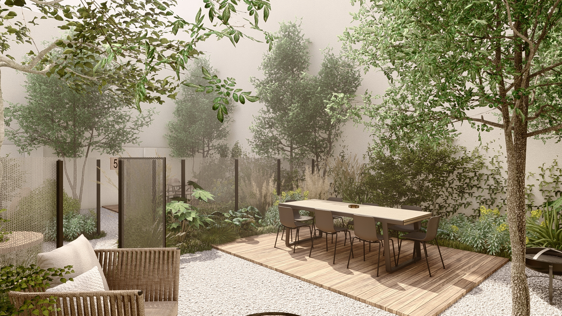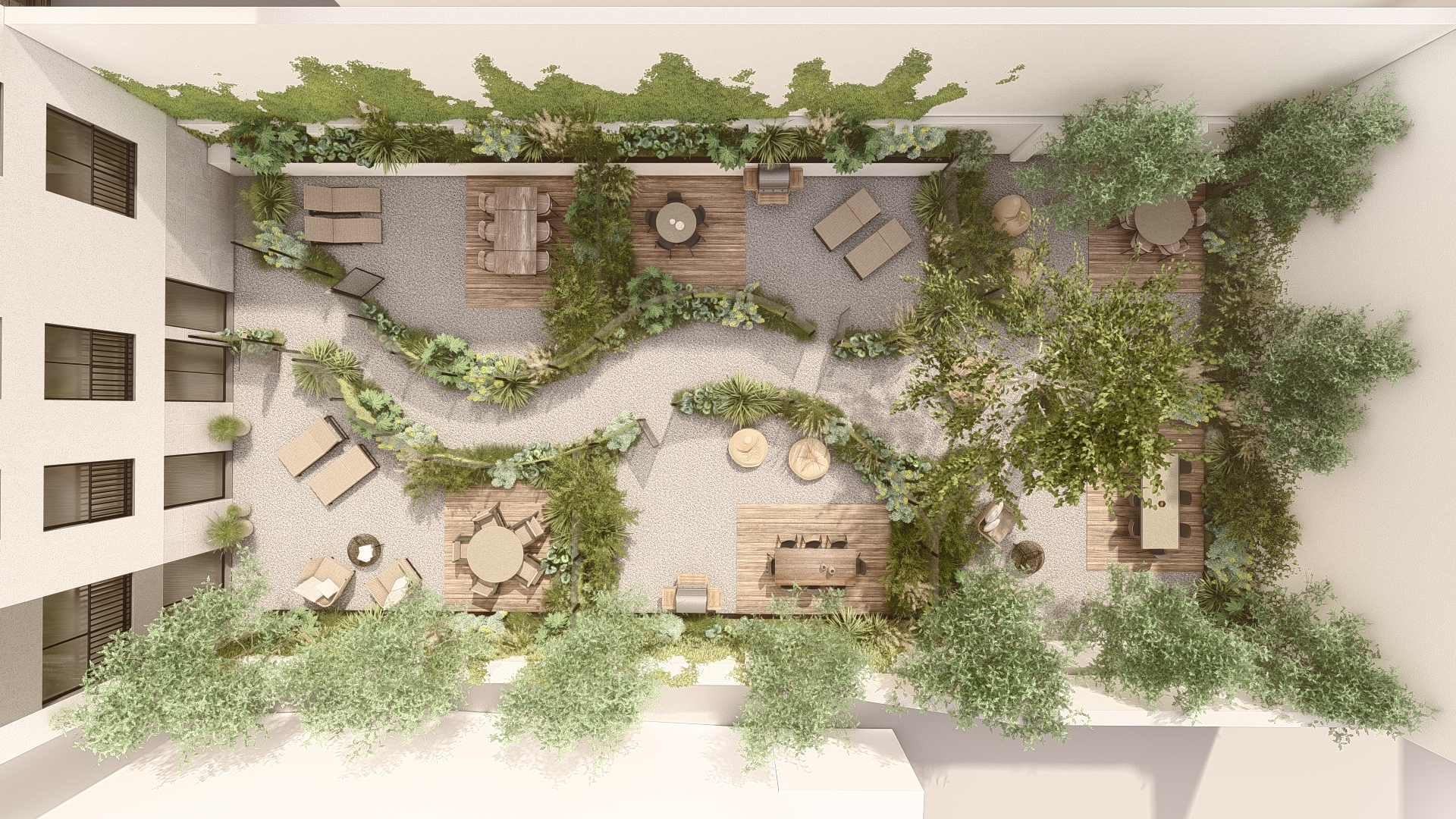 La magia está fuera. En esos senderos de grava que serpentean como arroyos entre jardines privados delimitados por celosías metálicas. En la vegetación que ha sido cuidadosamente seleccionada por Simbiosi Estudi: nativa, resiliente, sensorial.